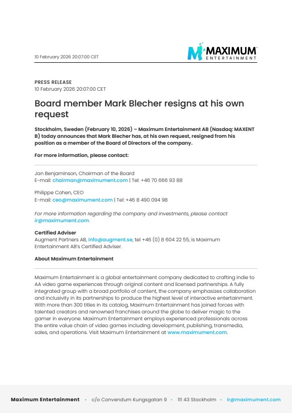 Stockholm, Sweden (February 10, 2026) – Maximum Entertainment AB (Nasdaq: MAXENT B) today announces that Mark Blecher has, at his own request, resigned from his position as a member of the Board of Directors of the company.
