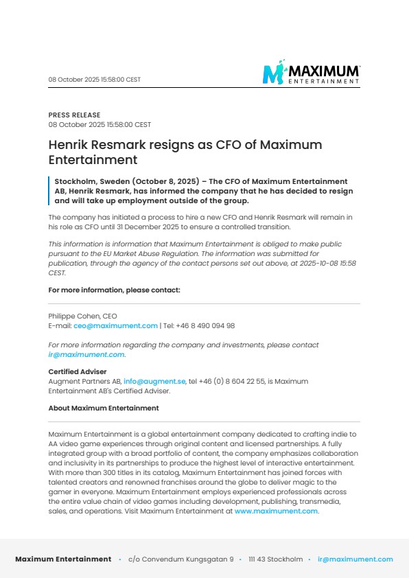 Stockholm, Sweden (October 8, 2025) – The CFO of Maximum Entertainment AB, Henrik Resmark, has informed the company that he has decided to resign and will take up employment outside of the group.