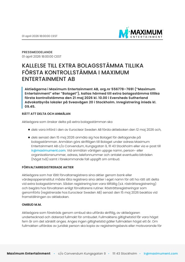 Aktieägarna i Maximum Entertainment AB, org.nr 556778–7691 (”Maximum Entertainment” eller ”Bolaget”), kallas härmed till extra bolagsstämma tillika första kontrollstämma den 21 maj 2026 kl. 10.00 i Eversheds Sutherland Advokatbyrås lokaler på Sveavägen 20 i Stockholm. Inregistrering inleds kl. 09.45.