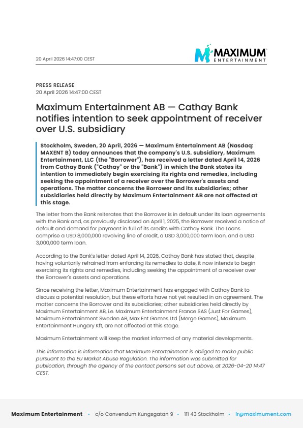 Stockholm, Sweden, 20 April, 2026 — Maximum Entertainment AB (Nasdaq: MAXENT B) today announces that the company's U.S. subsidiary, Maximum Entertainment, LLC (the "Borrower"), has received a letter dated April 14, 2026 from Cathay Bank ("Cathay" or the "Bank") in which the Bank states its intention to immediately begin exercising its rights and remedies, including seeking the appointment of a receiver over the Borrower's assets and operations. The matter concerns the Borrower and its subsidiaries; other subsidiaries held directly by Maximum Entertainment AB are not affected at this stage.