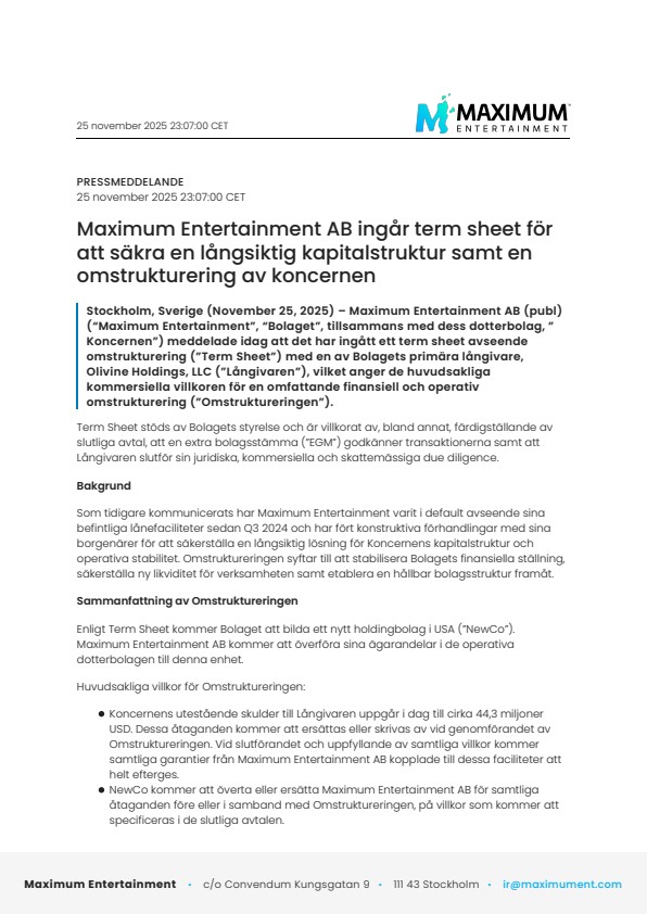 Stockholm, Sverige (November 25, 2025) – Maximum Entertainment AB (publ) (“Maximum Entertainment”, “Bolaget”, tillsammans med dess dotterbolag, ”Koncernen”) meddelade idag att det har ingått ett term sheet avseende omstrukturering (”Term Sheet”) med en av Bolagets primära långivare, Olivine Holdings, LLC (”Långivaren”), vilket anger de huvudsakliga kommersiella villkoren för en omfattande finansiell och operativ omstrukturering (”Omstruktureringen”).