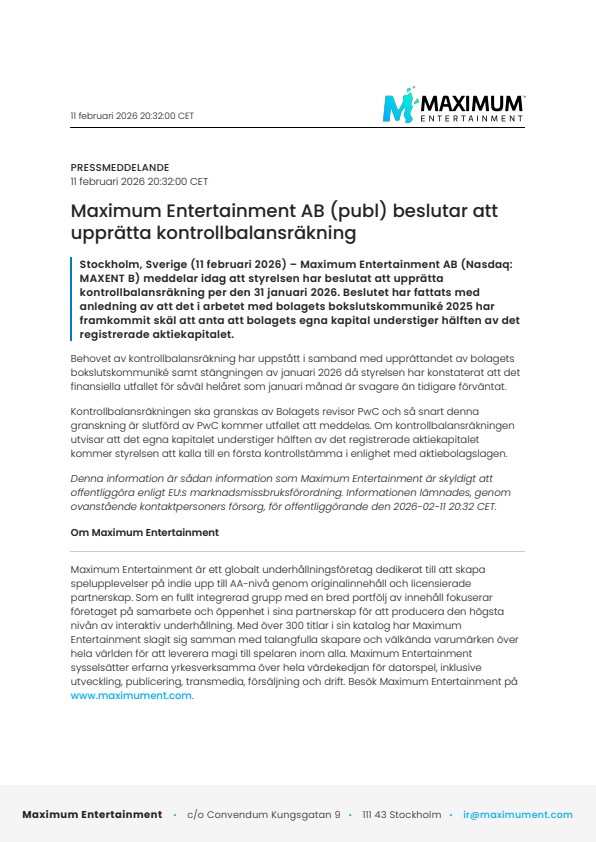 Stockholm, Sverige (11 februari 2026) – Maximum Entertainment AB (Nasdaq: MAXENT B) meddelar idag att styrelsen har beslutat att upprätta kontrollbalansräkning per den 31 januari 2026. Beslutet har fattats med anledning av att det i arbetet med bolagets bokslutskommuniké 2025 har framkommit skäl att anta att bolagets egna kapital understiger hälften av det registrerade aktiekapitalet.