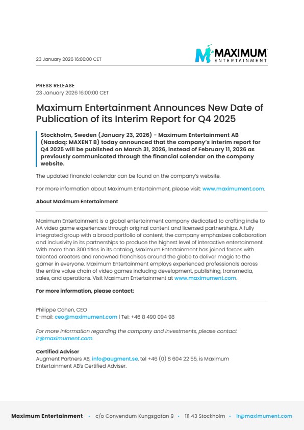 Stockholm, Sweden (January 23, 2026) – Maximum Entertainment AB (Nasdaq: MAXENT B) today announced that the company’s interim report for Q4 2025 will be published on March 31, 2026, instead of February 11, 2026 as previously communicated through the financial calendar on the company website.