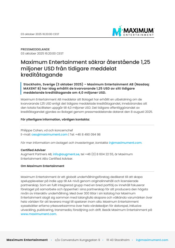 Maximum Entertainment AB meddelar att Bolaget har erhållit en utbetalning om de kvarvarande 1,25 USD enligt det tidigare meddelade kreditåtagandet, innebärandes att den totala faciliteten uppgår till 4,0 miljoner USD. Det tidigare offentliggörandet av kreditåtagandet gjordes av Bolaget genom pressmeddelande daterat den 8 augusti 2025.