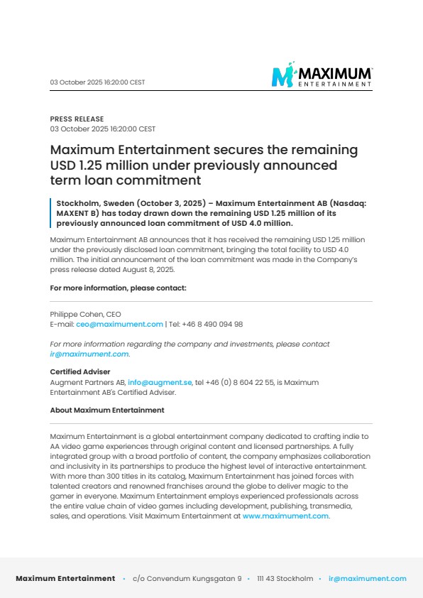 Stockholm, Sweden (October 3, 2025) – Maximum Entertainment AB (Nasdaq: MAXENT B) has today drawn down the remaining USD 1.25 million of its previously announced loan commitment of USD 4.0 million.