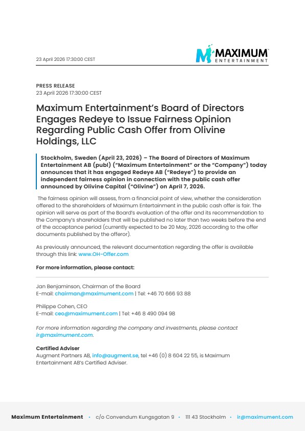 Stockholm, Sweden (April 23, 2026) – The Board of Directors of Maximum Entertainment AB (publ) (“Maximum Entertainment” or the “Company”) today announces that it has engaged Redeye AB (“Redeye”) to provide an independent fairness opinion in connection with the public cash offer announced by Olivine Capital (“Olivine”) on April 7, 2026.