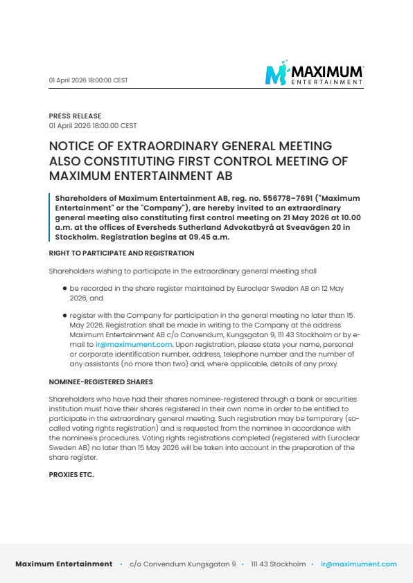 Shareholders of Maximum Entertainment AB, reg. no. 556778–7691 ("Maximum Entertainment" or the "Company"), are hereby invited to an extraordinary general meeting also constituting first control meeting on 21 May 2026 at 10.00 a.m. at the offices of Eversheds Sutherland Advokatbyrå at Sveavägen 20 in Stockholm. Registration begins at 09.45 a.m.