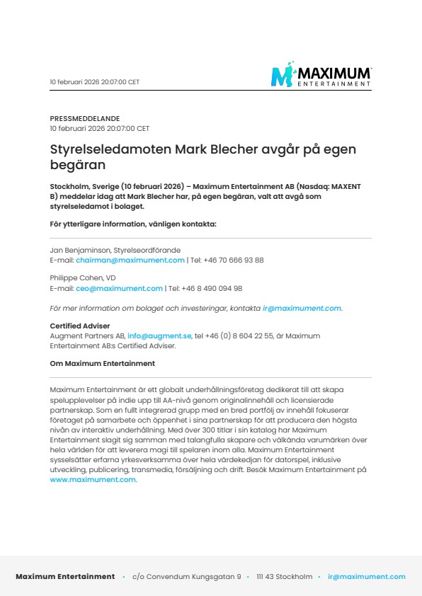 Stockholm, Sverige (10 februari 2026) – Maximum Entertainment AB (Nasdaq: MAXENT B) meddelar idag att Mark Blecher har, på egen begäran, valt att avgå som styrelseledamot i bolaget.